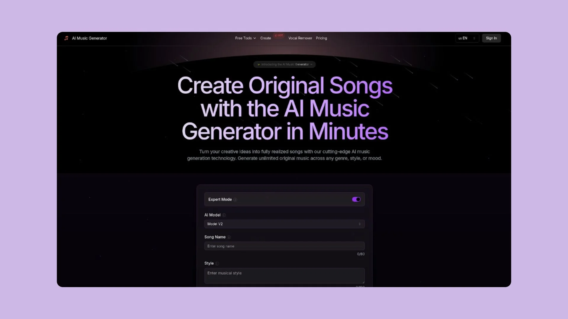 | Lyrics To Song | Enter your lyrics and the platform generates a song with matching music and vocals. |