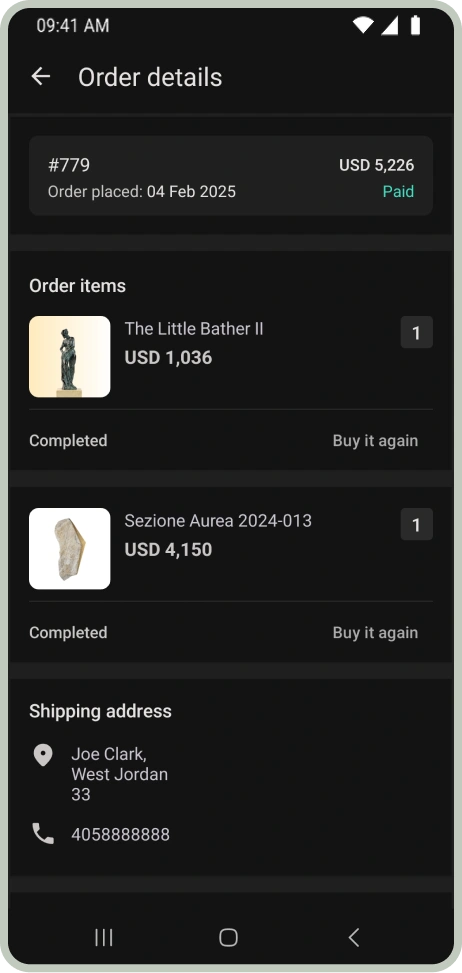 nandbox Art App Template offers a built-in order list feature where users can track their orders and review their order history directly from your app.