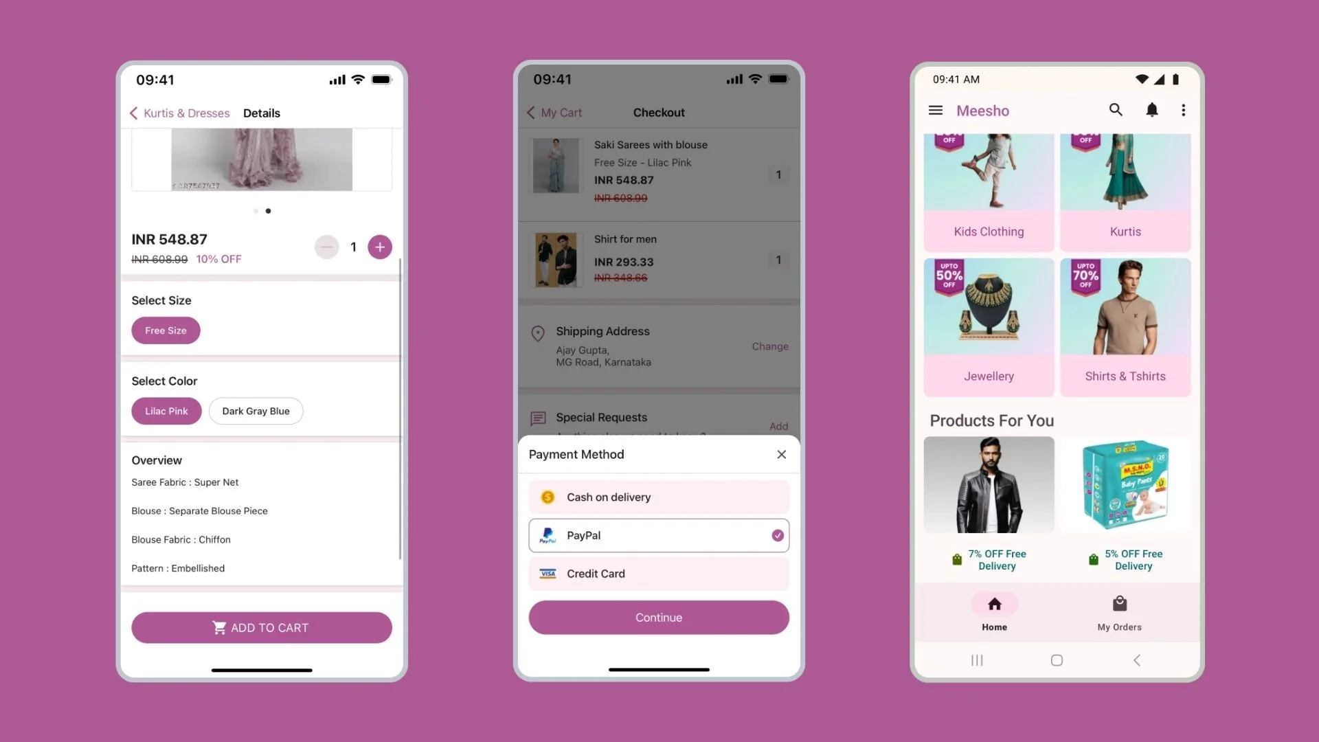Meesho uses a zero-inventory, drop-shipping model. That means that anyone can pick a product from the app, share it on WhatsApp, Facebook, or Instagram, and earn a profit margin on every successful order.