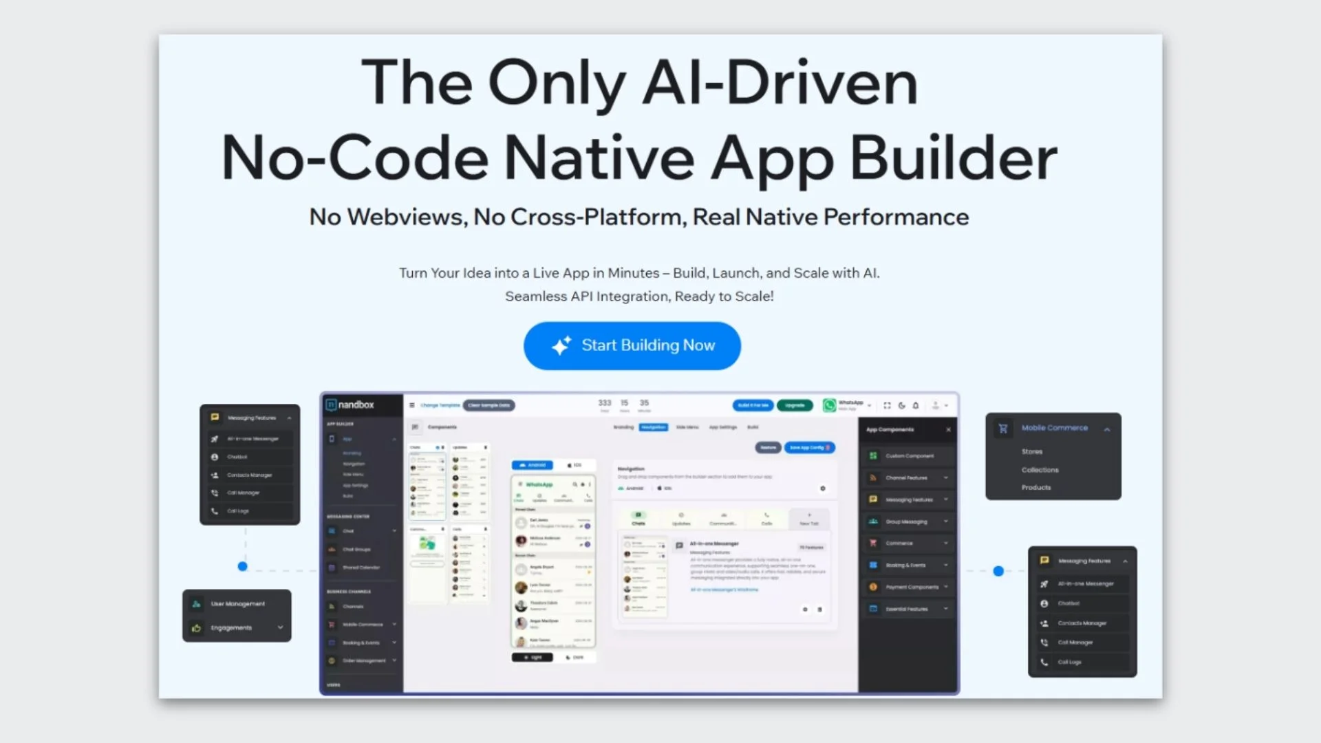 nandbox is a leading AI-powered no-code app builder that lets anyone with zero coding experience build their dream native iOS and Android apps easily at the lowest cost. You can create any type of app you want, including messaging and communications apps, for under $100/month.