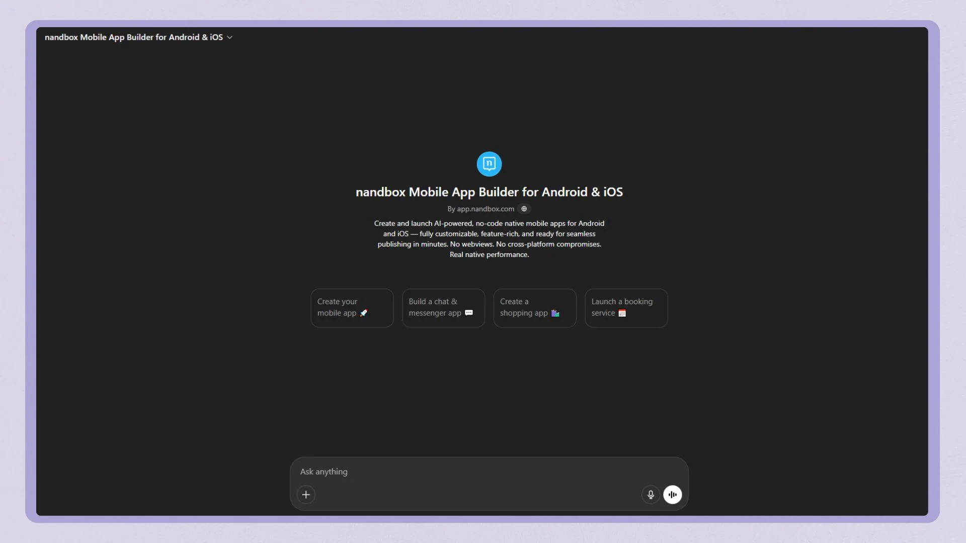 Ready to Build you native app using ChatGPT? nandbox App Builder GPT is the first and only AI mobile app builder that lets you create native Android and iOS apps just by chatting with ChatGPT. It’s free to try; no code is needed, and no credit card is needed. So what are you waiting for? Start building your native app now!