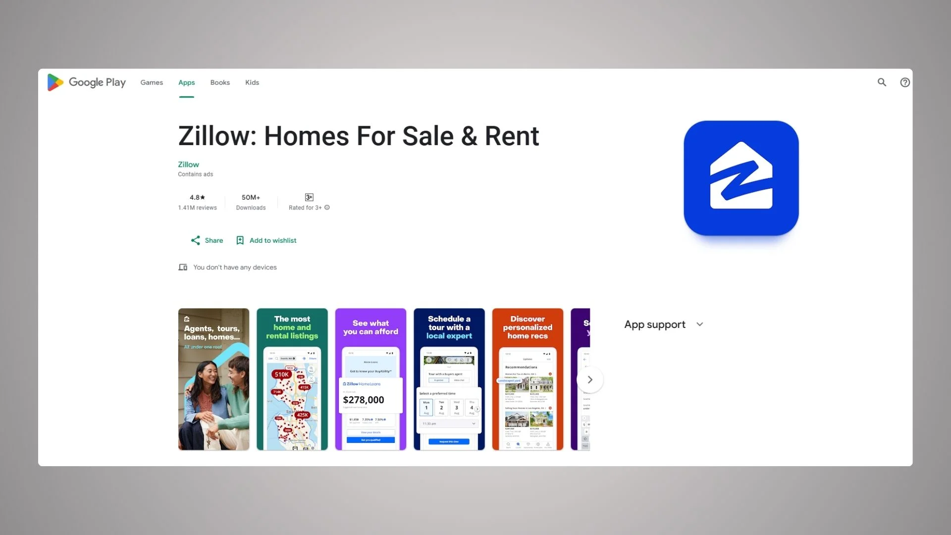• App Rating: Zillow has an average rating of 4.7 stars on the Apple App Store and 4.4 stars on Google Play based on thousands of reviews.