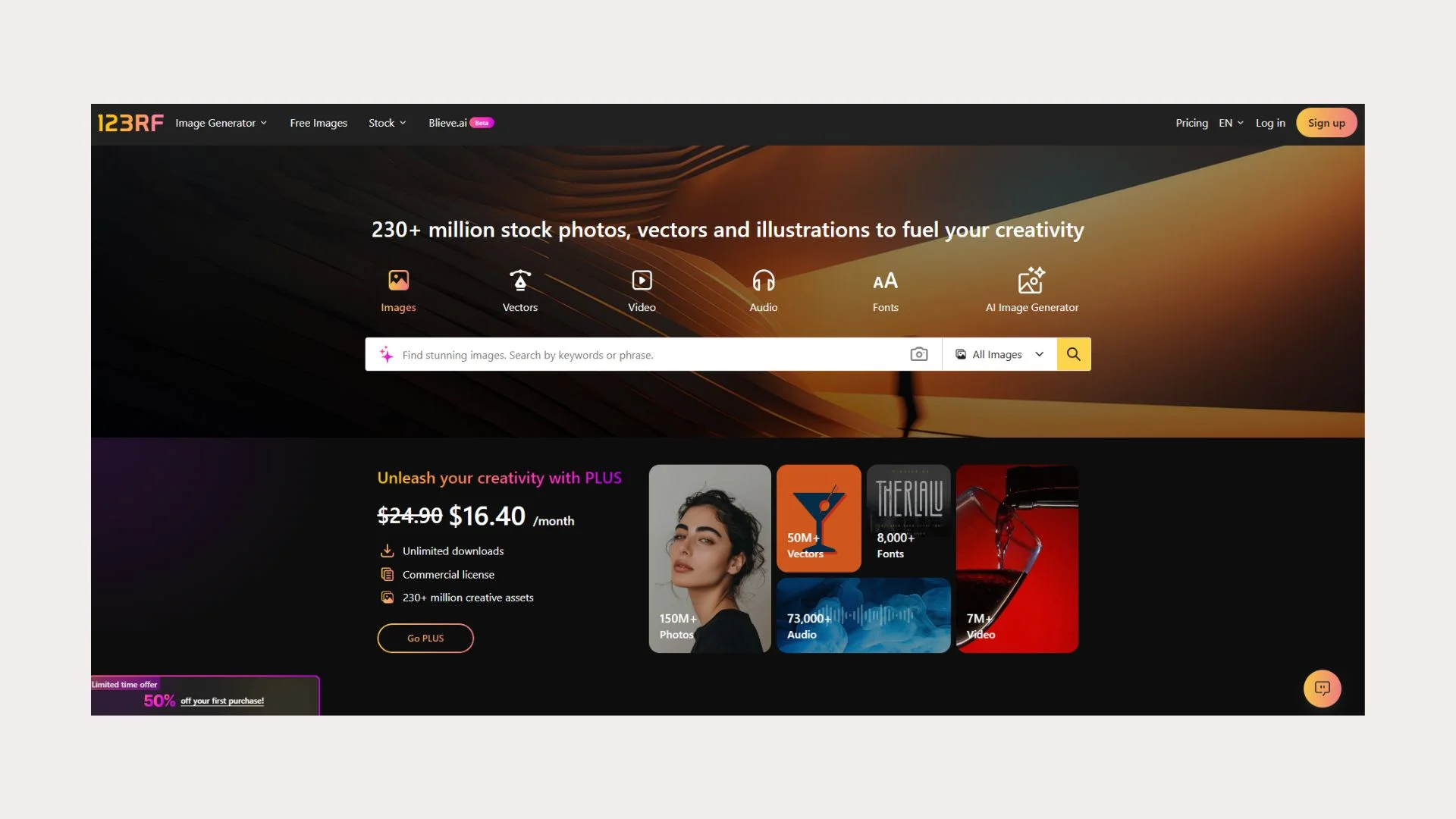 - Best For: Professional-grade stock photos, illustrations, vectors, and videos for businesses, advertisers, and marketers