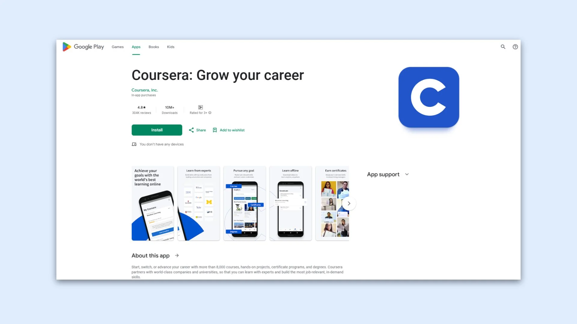 - App Cost: Free Courses, Paid Certificates, Coursera Plus for $59/mo