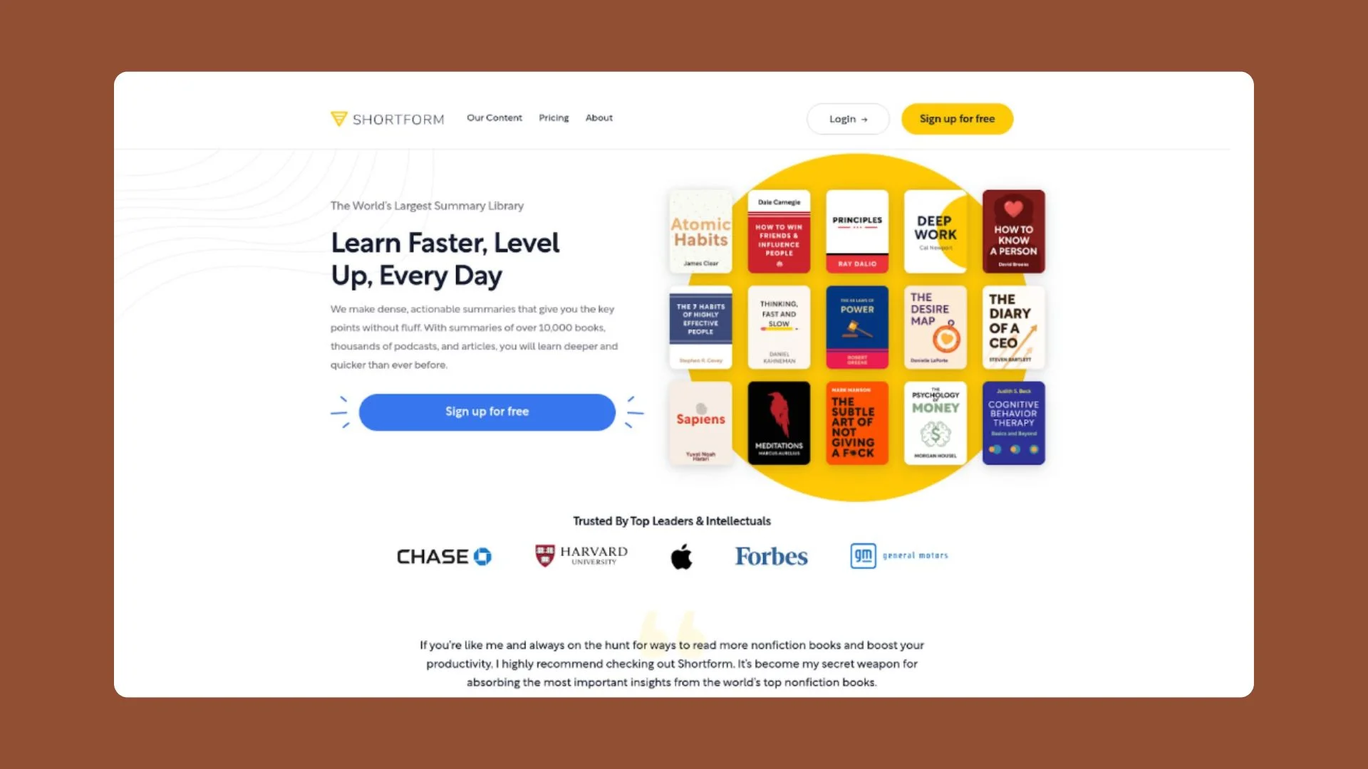 Shortform is a great fit for anyone who wants to get the most out of reading but struggles to find time. Whether you are a student hoping to review key ideas, a professional looking to improve at work, or simply curious about learning new things every day, these Book Summaries make that easy. Many top thinkers, teachers, business leaders, and everyday readers trust Shortform for its high-quality and trustworthy content. If you want to try before you buy, there’s even a free trial!