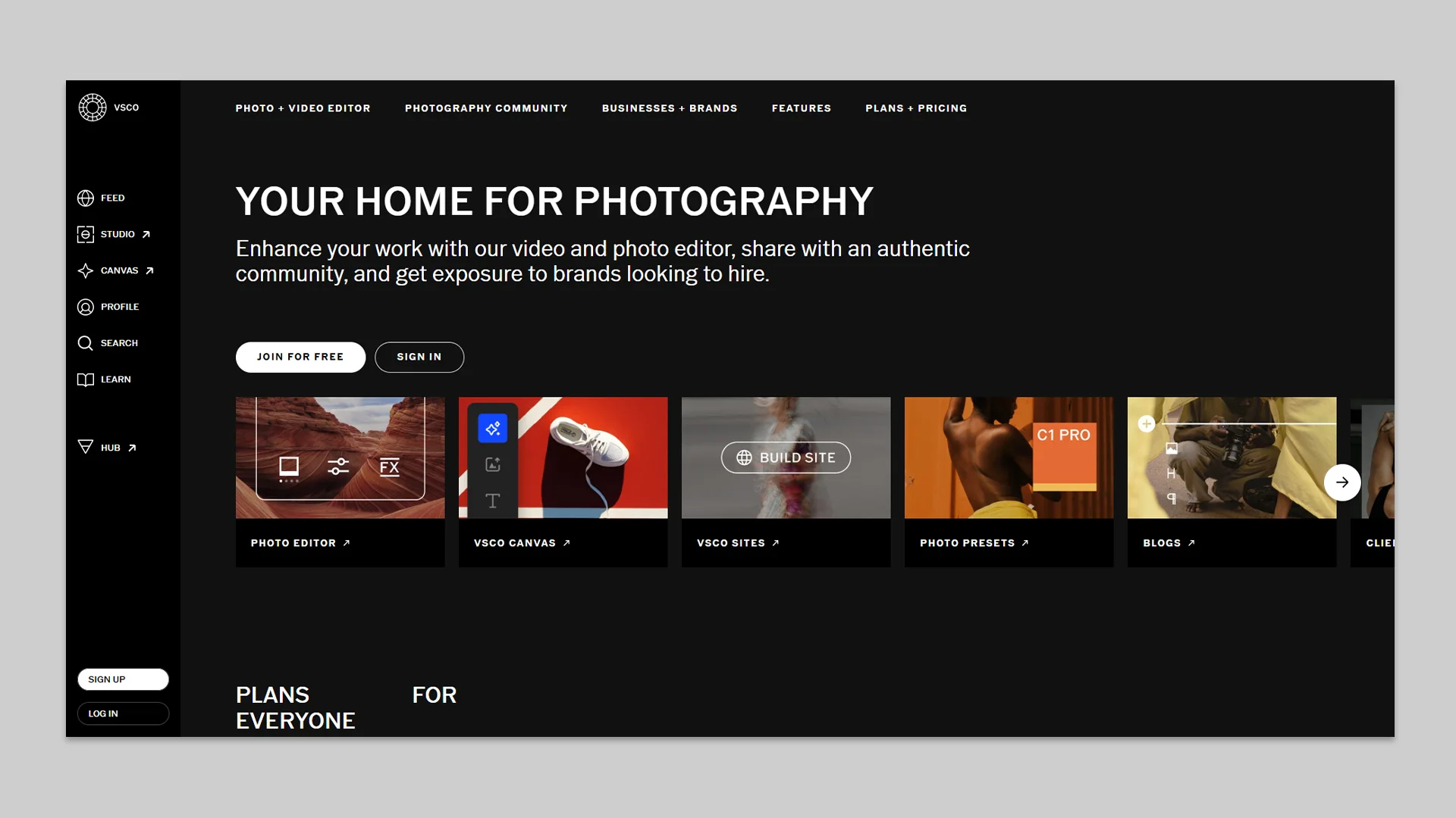 - Editing Features & Tools: Vintage photo and video presets, Feed planner, Film frames and effects, Story templates, Film camera, Overlays, Batch editing, Editing tools
